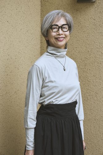 トレードマークのグレイヘアに、アクセサリーや小物で着こなすのが依田さんのスタイル。